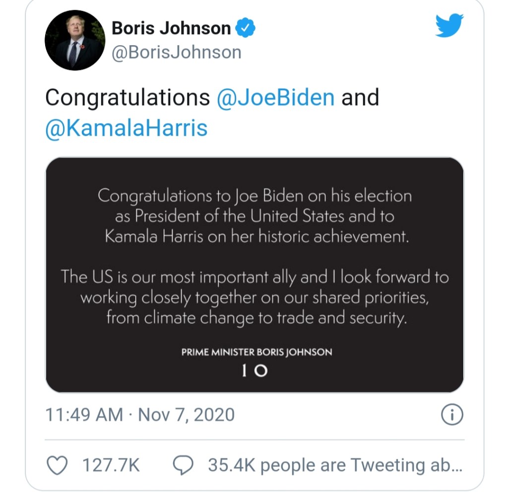 El primer ministro del Reino Unido, Boris Johnson envió sus felicitaciones a Kamala Harris y Joe Biden y pidió trabajar juntos a favor de la seguridad y el cambio climático.