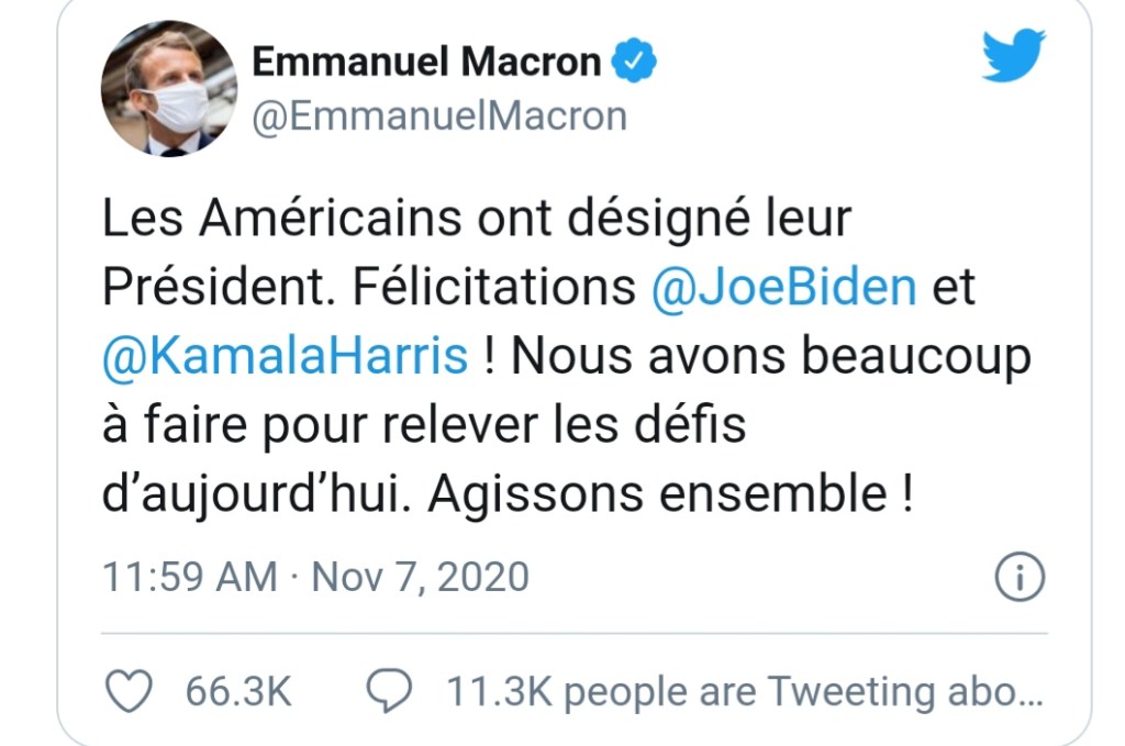 El presidente de Francia, Emmanuel Macron, señaló que, junto con la terna triunfadora en Estados Unidos, “hay mucho que hacer para enfrentar los retos actuales”.