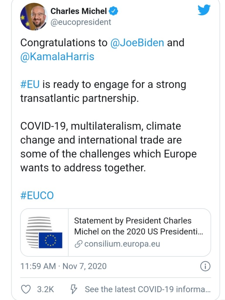 El presidente del Consejo Europeo Charles Michel pidió una “alianza sólida” a Biden.