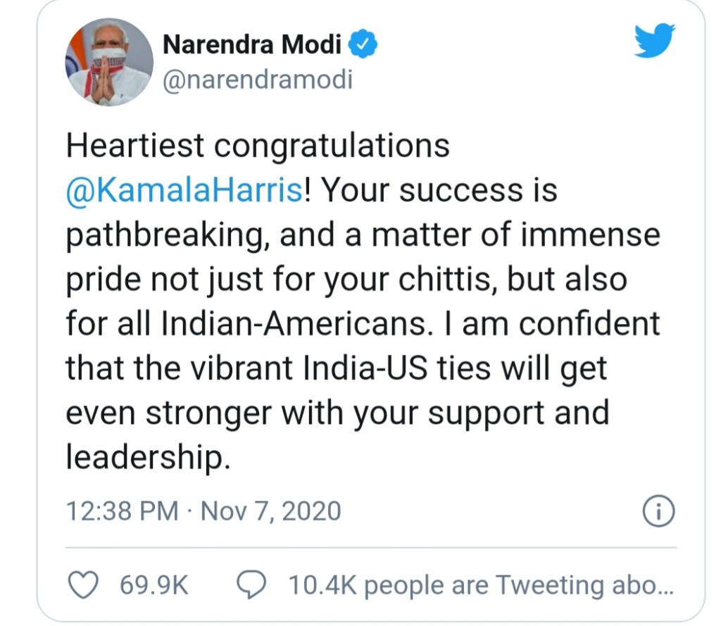 El primer ministro de la India, Narendra Modi, felicitó a Joe Biden por su victoria en los comicios presidenciales estadounidenses y en especial a su compañera de planilla, Kamala Harris, de “orígenes hindús, y por su éxito demoledor”.