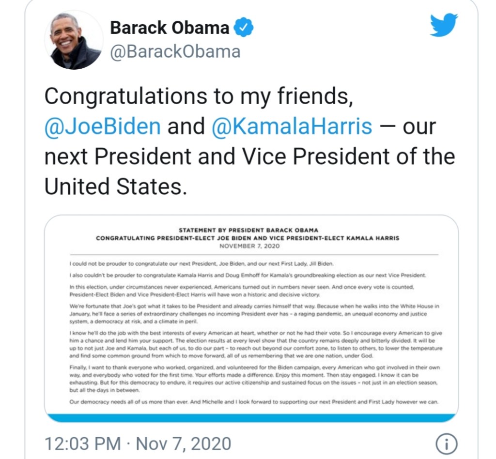 El expresidente Barack Obama felicitó a Biden por su “histórica” victoria en las elecciones, en un comunicado donde reconoció la trayectoria de la dupla ganadora y sentirse orgulloso de ellos.