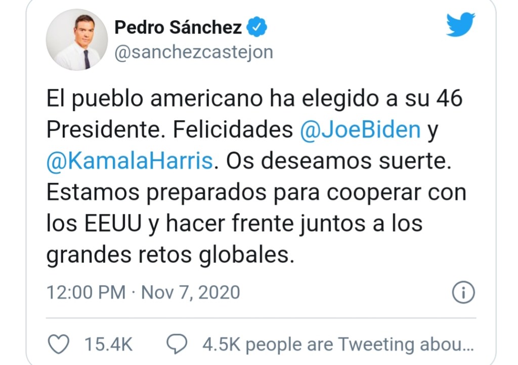 Pedro Sánchez, presidente del gobierno de España felicitó a la dupla demócrata y señaló que se encuentran listos para trabajar con los Estados Unidos.