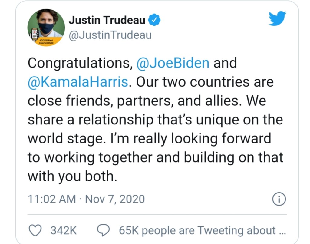 El primer ministro canadiense, Justin Trudeau, felicitó este sábado a Joe Biden y Kamala Harris por su elección a la presidencia y vicepresidencia de Estados Unidos, menos de una hora tras el anuncio del resultado por los grandes medios estadounidenses.