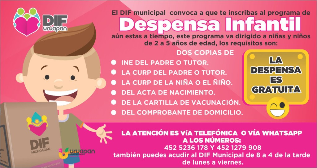 El Sistema Dif invita a los padres de familia para su integración al programa de despensa infantil, destinado a niños de dos a cinco años de edad. Se trata de un programa gratuito.