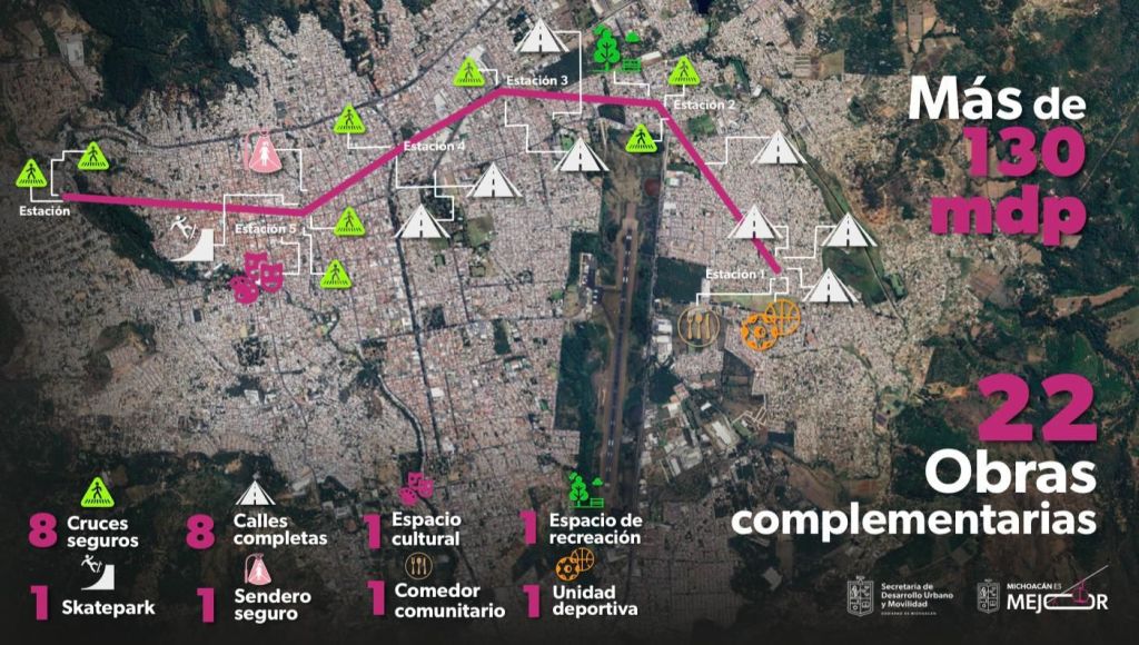 Entre las obras complementarias destacan ocho cruces seguros, ocho calles completas, un espacio de recreación, un skatepark, un sendero seguro, un comedor comunitario y una unidad deportiva.