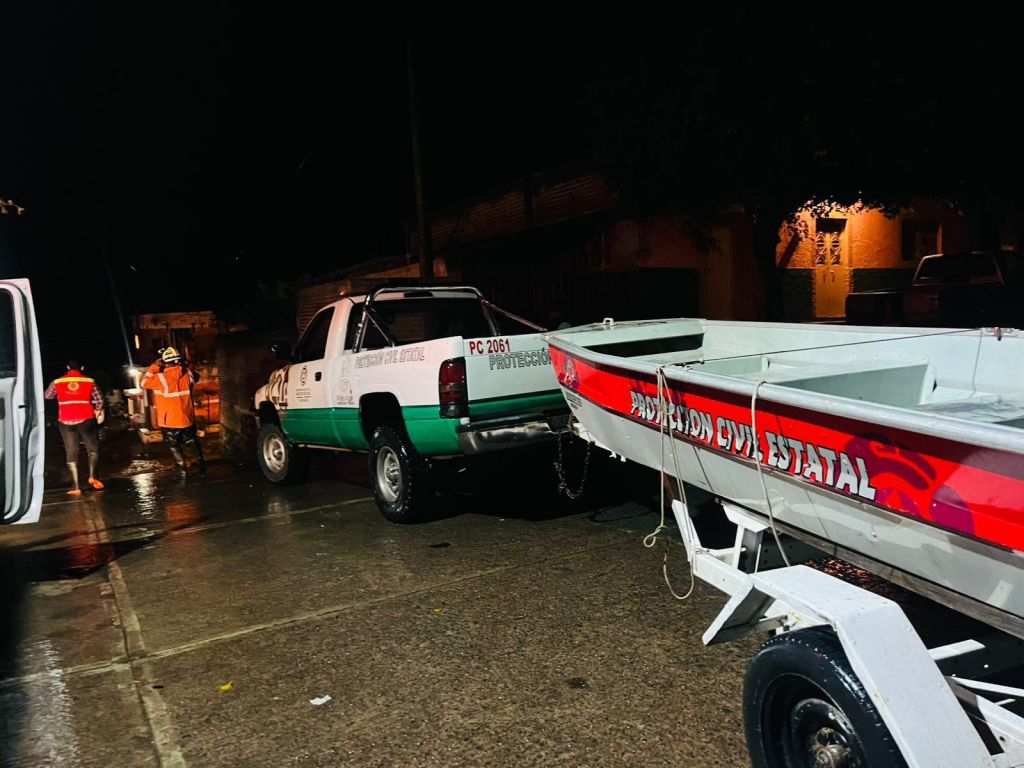 Elementos de la Guardia Civil llevan a cabo recorridos de monitoreo en las zonas donde incrementó el nivel del agua, así como las colonias afectadas por las lluvias, sitios en donde agilizan la atención de vecinos damnificados.