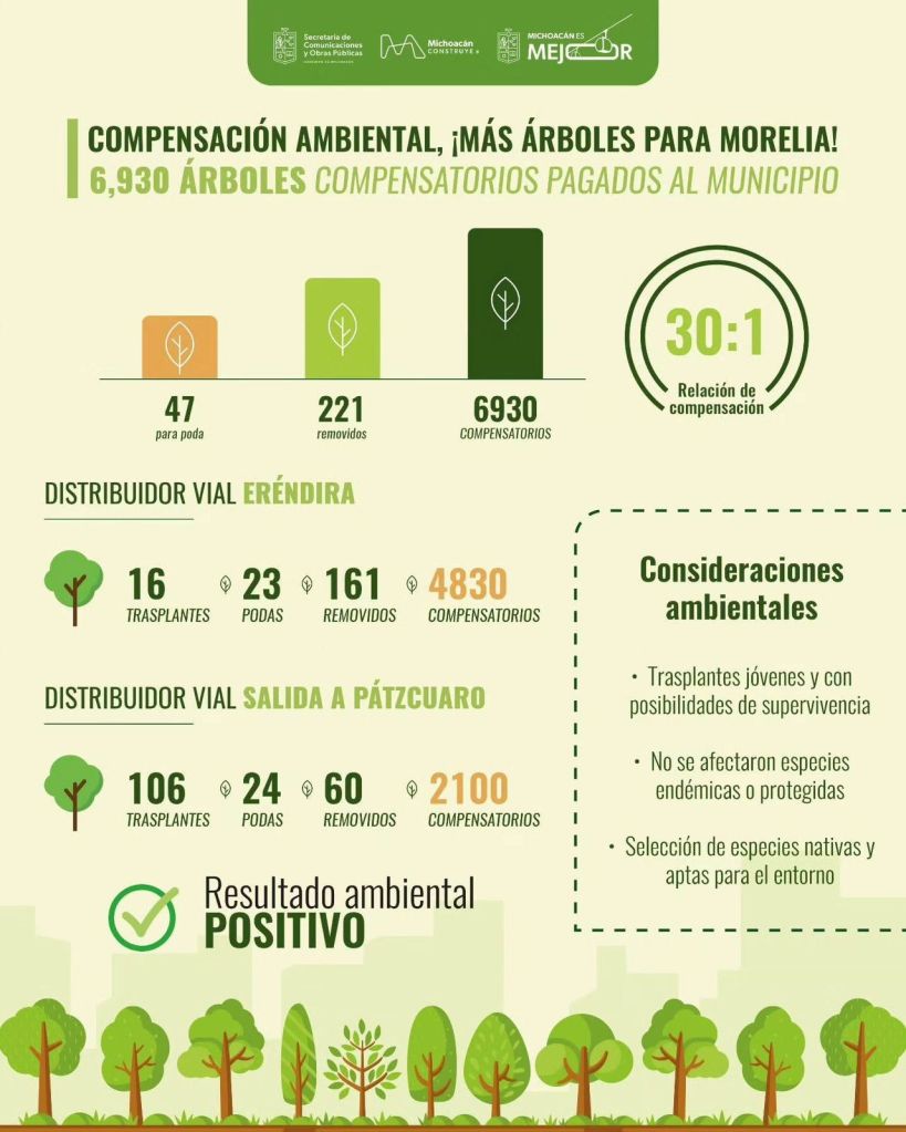 Asimismo, en el distribuidor vial de la salida a Pátzcuaro, trasplantó 106 árboles, podó 24 y removió 60; en consecuencia, compensó un total de dos mil 100 ejemplares, a fin de garantizar que el resultado para el ambiente sea positivo.