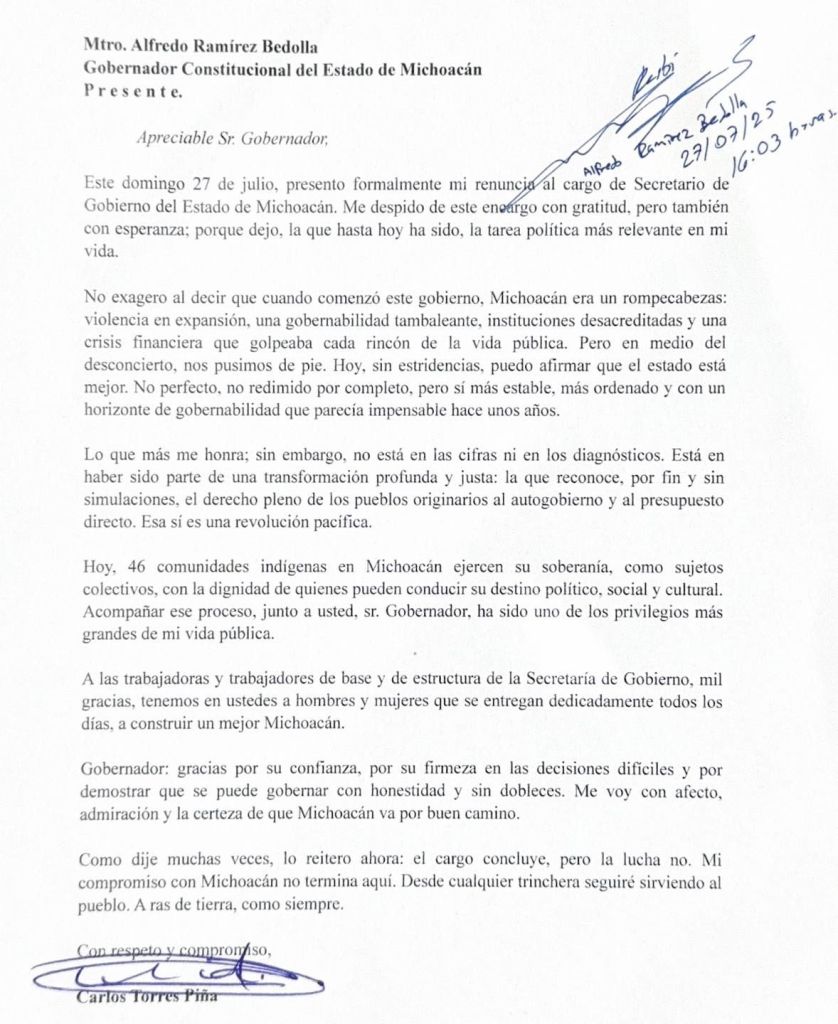 Morelia, Michoacán, 27 de julio de 2025.- Carlos Torres Piña presentó este domingo su renuncia al cargo de secretario de Gobierno del Estado de Michoacán, puesto que calificó como la tarea política más relevante de su vida.