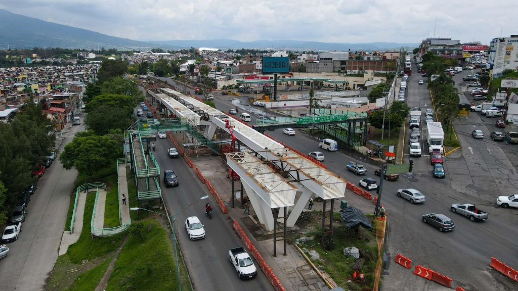 El titular de la SCOP informó que la construcción de la nueva vialidad avanza con la edificación del puente sur, en el tramo con sentido Tecnológico-Charo. La nueva obra contará con 10 carriles en total: seis elevados y cuatro a nivel en ambos sentidos.