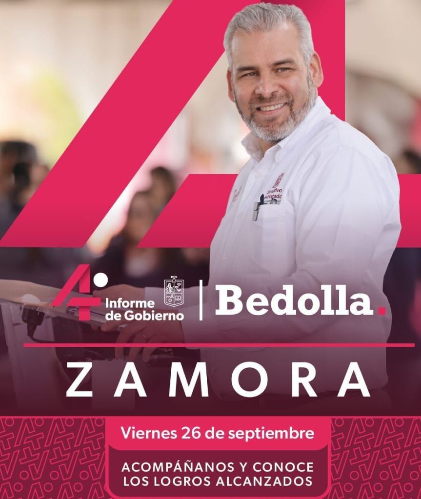 Morelia, Michoacán, 26 de septiembre de 2025.- Este viernes el gobernador Alfredo Ramírez Bedolla rendirá un informe regional en Zamora, donde destacará los avances que registra la administración estatal en diversos rubros como infraestructura carretera y obras hídricas.