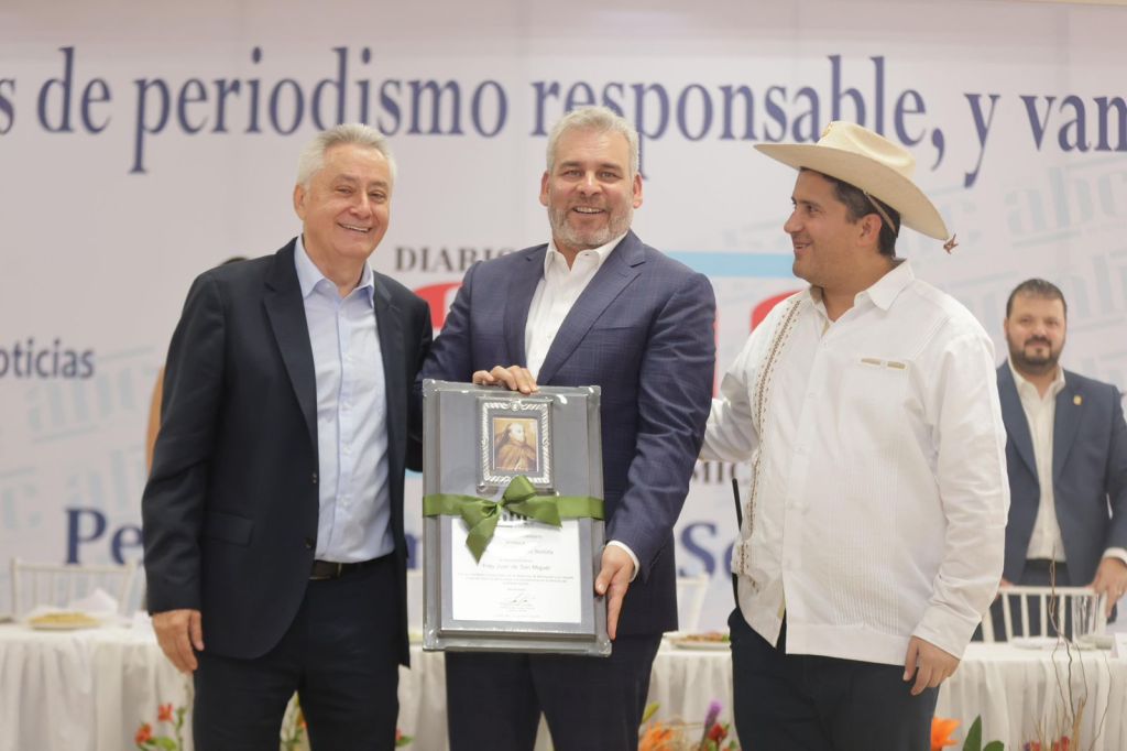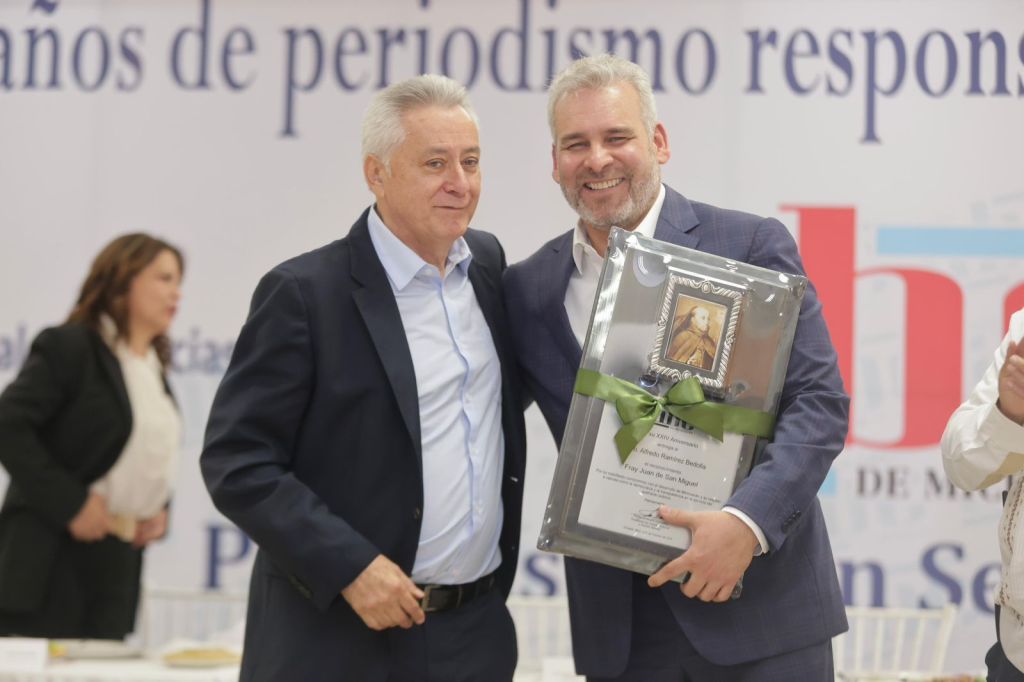 Uruapan, Michoacán, 21 de octubre de 2025.- El gobernador Alfredo Ramírez Bedolla recibió el reconocimiento Fray Juan de San Miguel, que entrega cada año el periódico ABC de Michoacán en el marco de su aniversario, de manos de su presidente y director general, Pedro Andrade González.