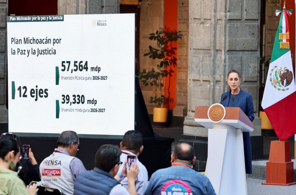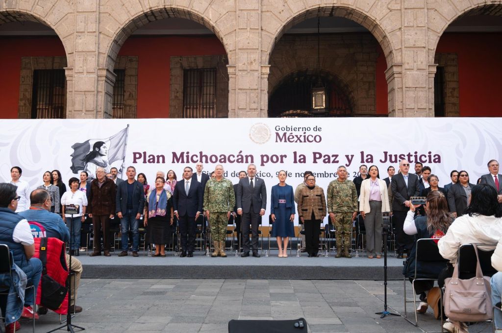Ciudad de México, 9 de noviembre de 2025.- El gobernador Alfredo Ramírez Bedolla y la presidenta Claudia Sheinbaum Pardo presentaron el Plan Michoacán por la Paz y la Justicia, estrategia integral que contempla 57 mil millones de pesos del Gobierno federal y 2 mil 700 millones del Gobierno estatal para 100 acciones en 12 ejes como seguridad, justicia, salud, educación, infraestructura, desarrollo, entre otros rubros.