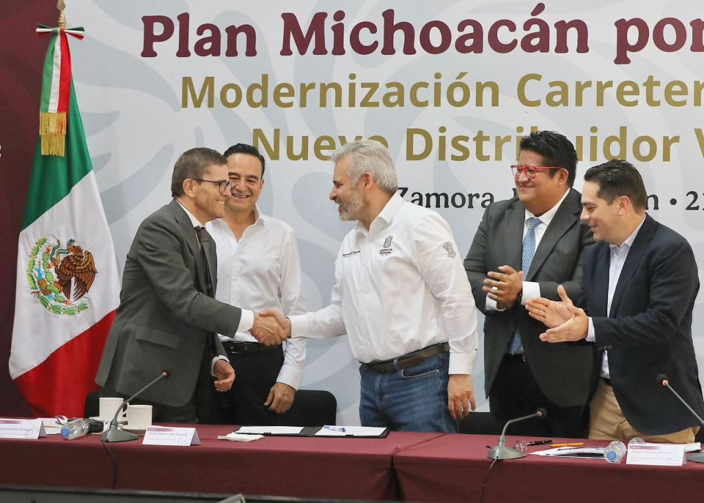 El mandatario firmó un nuevo título de concesión con el director de la empresa Red Carreteras de Occidente (RCO), Gonzalo Alcalde Rodríguez, para la renovación de 3.6 kilómetros de la carretera El Sauz-La Rinconada y la construcción de un distribuidor vial, obras que beneficiarán a los habitantes de Zamora, Ecuandureo, Jacona e Ixtlán.