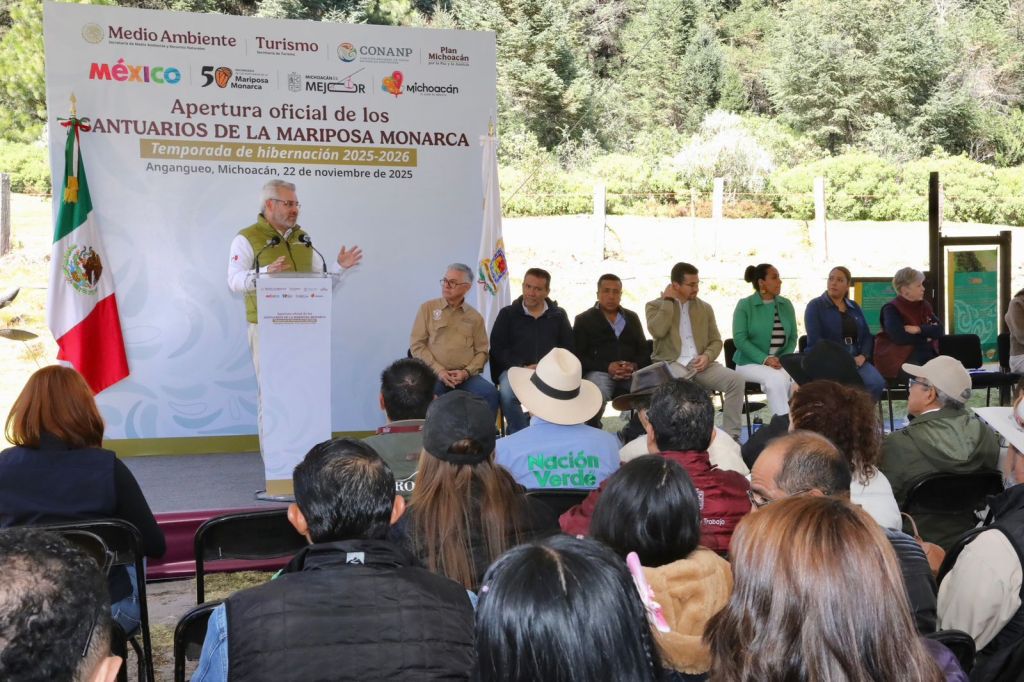 Angangueo, Michoacán, 22 de noviembre de 2025.- Desde el Santuario de Sierra Chincua en el municipio de Angangueo, el gobernador de Michoacán, Alfredo Ramírez Bedolla y las secretarias federales de Medio Ambiente y de Turismo, Alicia Isabel Adriana Bárcena Ibarra y Josefina Rodríguez Zamora, respectivamente, inauguraron de manera oficial la temporada de hibernación 2025-2026 de la Mariposa Monarca.