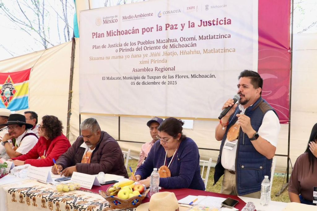 Tuxpan, Michoacán, 5 de diciembre de 2025.- El director general del Instituto Nacional de los Pueblos Indígenas (INPI), Adelfo Regino Montes, visitó el oriente de Michoacán para encabezar la primera asamblea del Plan de Justicia de los Pueblos Mazahua, Otomí, Matlatzinca o Pirinda, para construir acuerdos de manera conjunta que beneficien a la población de las comunidades originarias.