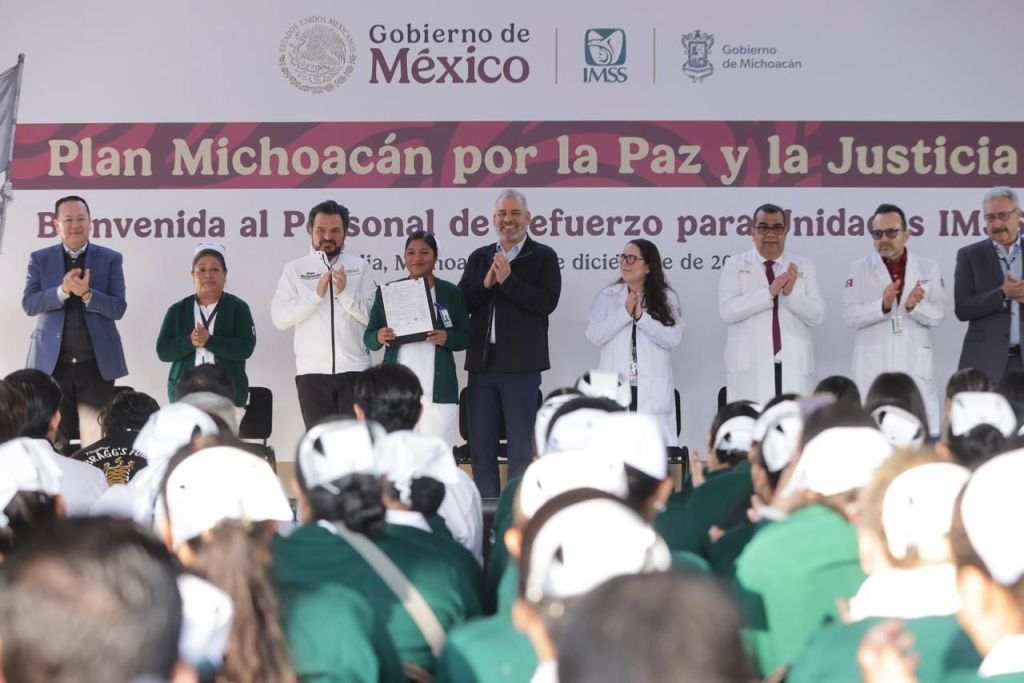 Morelia, Michoacán, 16 de diciembre de 2025.- El gobernador Alfredo Ramírez Bedolla y el director general del IMSS, Zoé Robledo Aburto, entregaron 270 bases a personal de salud, para reforzar los servicios que se ofrecen en las unidades médicas rurales y urbanas del Instituto Mexicano del Seguro Social en el estado, como parte del Plan Michoacán por la Paz y la Justicia.
