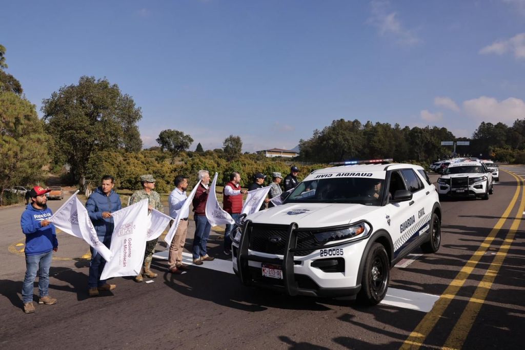 Zacán, Michoacán, 9 de enero de 2025.- Para reforzar la seguridad en el tramo carretero Uruapan-Peribán, el gobernador Alfredo Ramírez Bedolla en la comunidad con autogobierno de Zacán, puso en marcha el operativo Guardianes del Camino, integrado por Guardia Civil, Ejército Mexicano y Guardia Nacional.