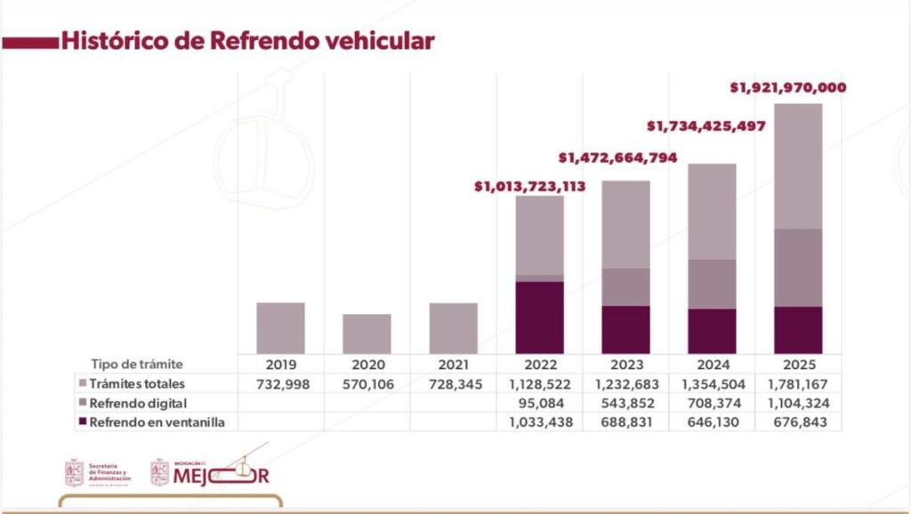 En tanto, el secretario de Finanzas y Administración, Luis Navarro García, detalló que en el 2025 se realizaron un millón 781 mil 167 trámites totales de refrendo vehicular, de los cuales, un millón 104 mil 324 se efectuaron vía digital y 676 mil 843 en ventanilla.