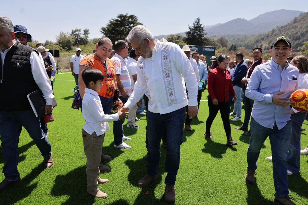 Charapan, Michoacán, 8 de marzo de 2026.- El gobernador Alfredo Ramírez Bedolla inauguró en la comunidad indígena con autogobierno de San Felipe de los Herreros, una cancha de futbol 7, para beneficio de más de 13 mil 500 habitantes, como parte de la estrategia estatal de recuperación de espacios públicos para la prevención del delito.