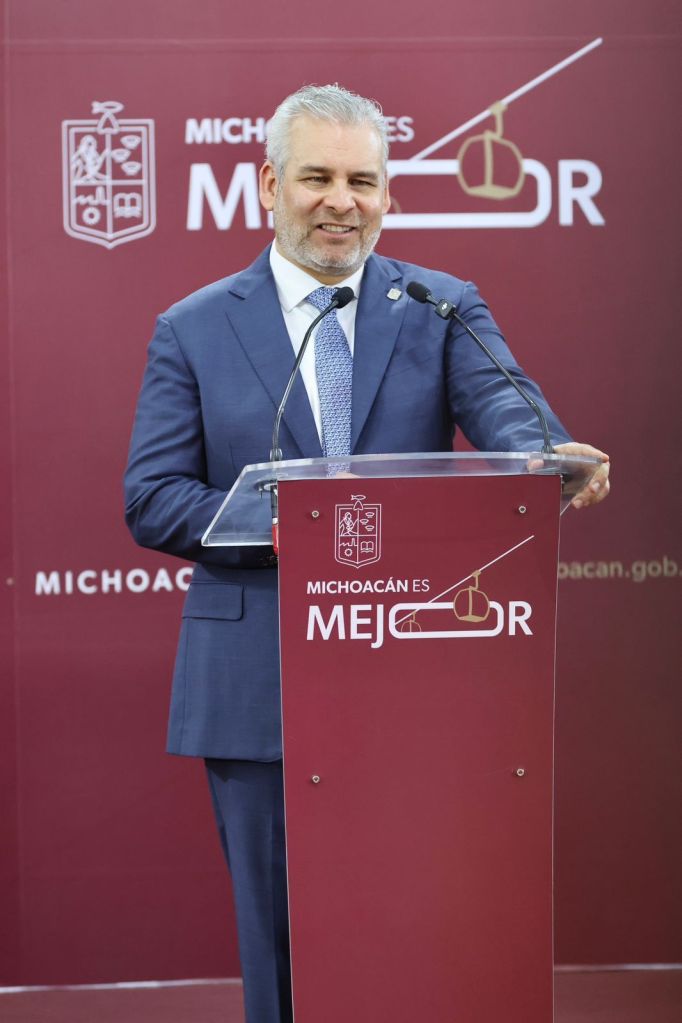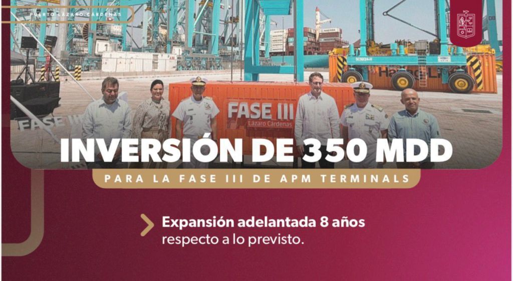 Morelia, Michoacán, 23 de marzo de 2026.- Con una nueva inversión de 350 millones de dólares, por parte de la empresa operadora portuaria APM Terminals, el puerto de Lázaro Cárdenas aumentará su capacidad de carga a 4 millones 200 mil TEUs al año, informó el gobernador Alfredo Ramírez Bedolla.