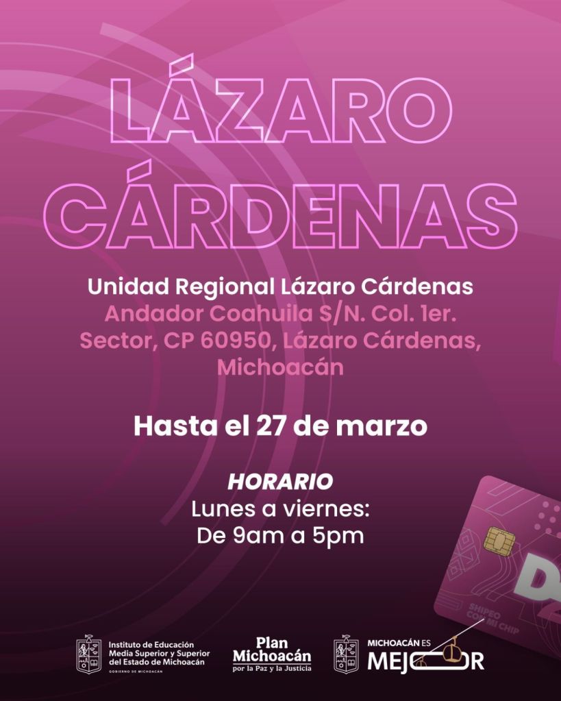 Estas sedes ahora permitirán a las y los jóvenes nicolaitas de Lázaro Cárdenas, Uruapan y Zamora realizar el trámite de manera ágil y cercana, sin necesidad de trasladarse a la capital, facilitando así su acceso a herramientas digitales para el desarrollo académico. A través de las Unidades Regionales de la Secretaría de Educación del Estado (SEE) podrán recoger su chip hasta el viernes 27 de marzo, en un horario de 09:00 a 17:00 horas.