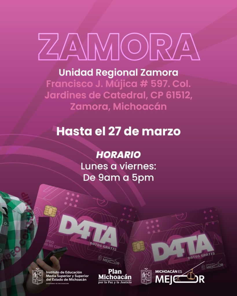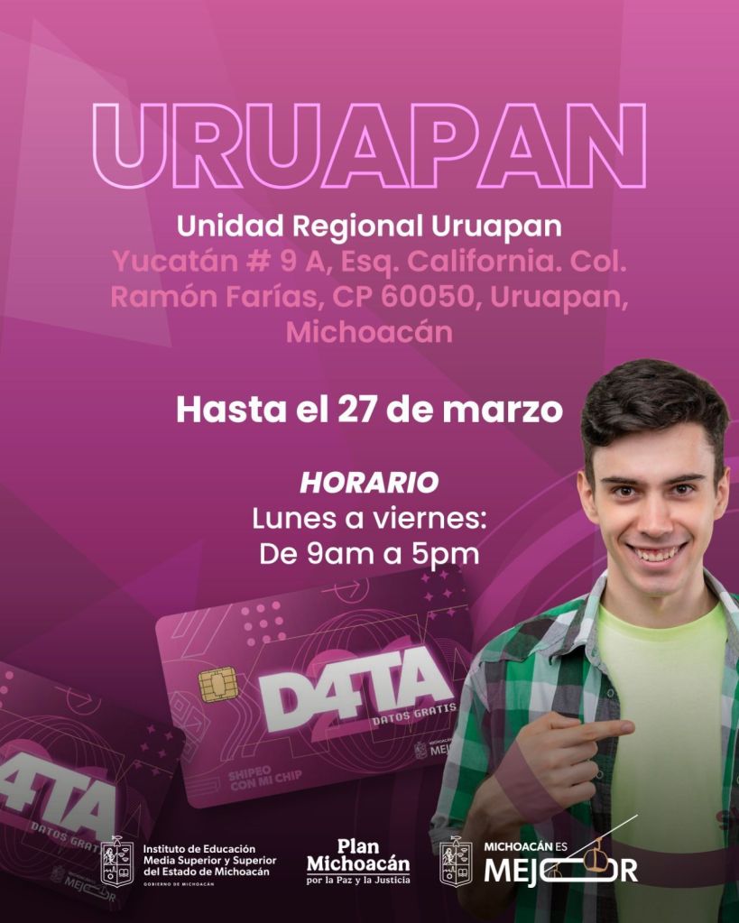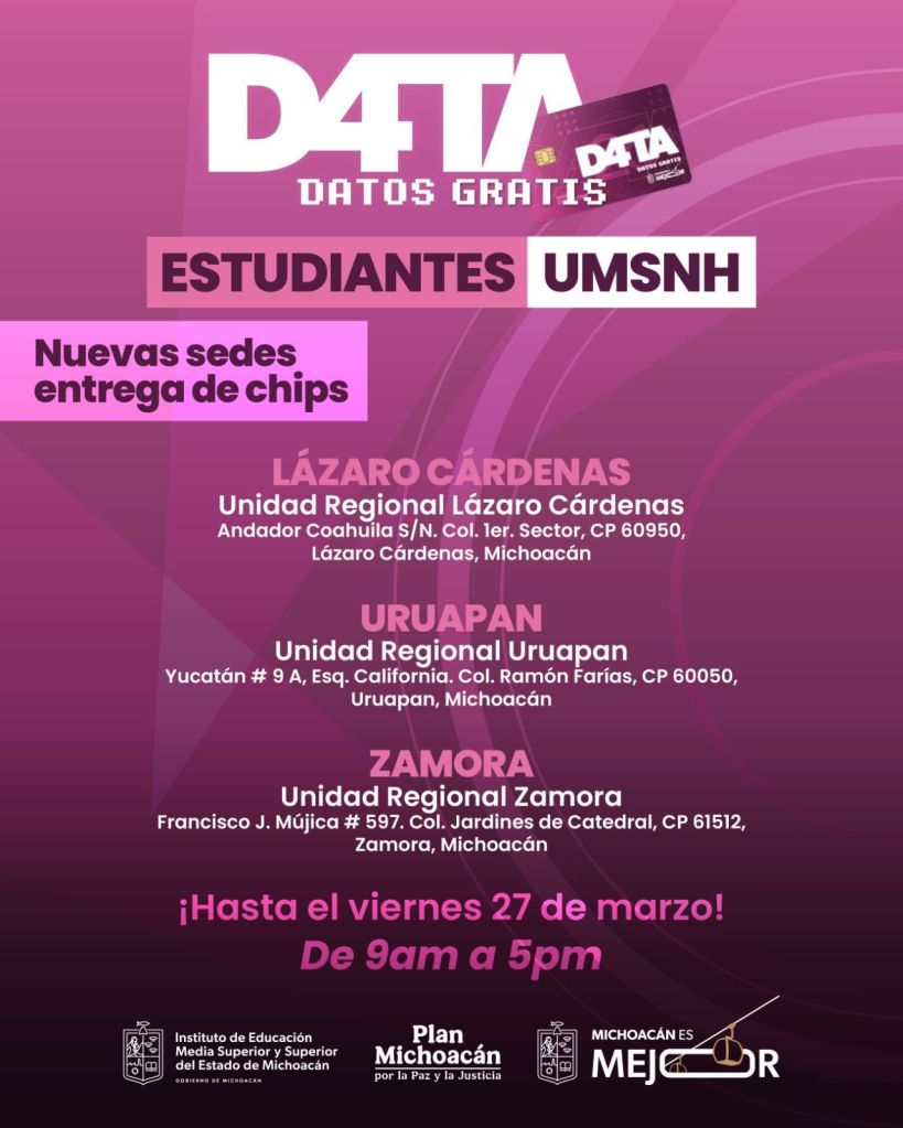 Morelia, Michoacán, 25 de marzo de 2026.- Para acercar los beneficios del Programa D4TA Datos Gratis a todas las regiones del estado, el Instituto de Educación Media Superior y Superior del Estado (Iemsysem) invita a estudiantes de la Universidad Michoacana de San Nicolás de Hidalgo (UMSNH) a conocer y acudir a las sedes habilitadas en el interior del estado para recoger y activar su chip con internet gratuito.
