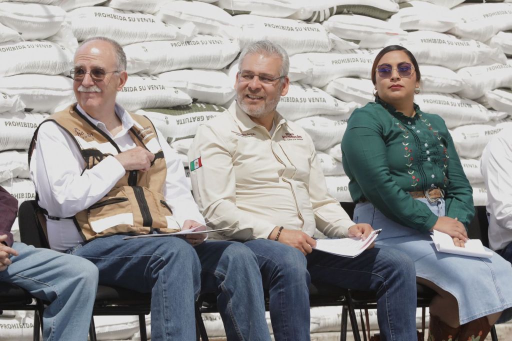 Maravatío, Michoacán, 27 de marzo de 2026.- El gobernador Alfredo Ramírez Bedolla junto con Julio Berdegué Sacristán, secretario de Agricultura y Desarrollo Rural, dieron arranque al Programa Fertilizantes para el Bienestar 2026, el cual se entregará este año de manera gratuita a 90 mil productores de todo el estado para cubrir cerca de 140 mil hectáreas de cultivos de maíz, frijol, caña, arroz, limón y berries, entre otros.