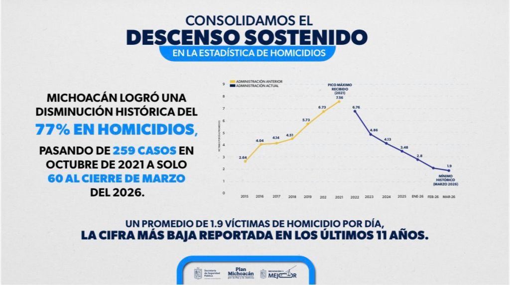 Durante la presentación de los indicadores de seguridad, el mandatario estatal destacó la efectividad de la estrategia al comparar el panorama actual con el inicio de su gestión. “La reducción del 77 por ciento de homicidios, esto en víctimas es una reducción impresionante porque pasamos de 259 homicidios dolosos mensuales en el 2021 a 60 al cierre de marzo de 2026, es decir, prácticamente estamos evitando 200 homicidios al mes”, detalló Ramírez Bedolla.