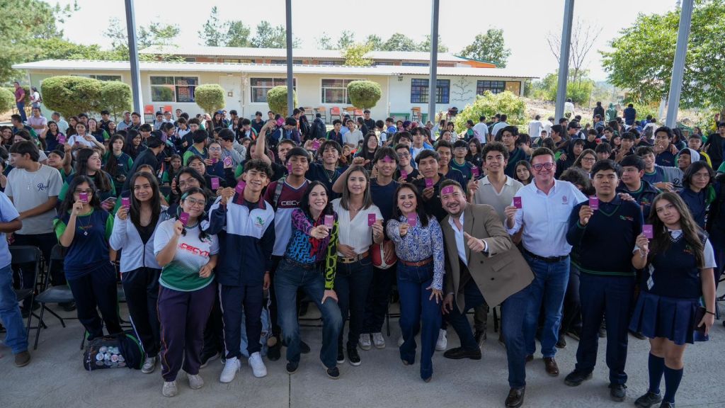 Uruapan, Michoacán, 16 de abril de 2026.- La secretaria de Desarrollo Urbano y Movilidad, Gladyz Butanda Macías, entregó tarjetas prepago de transporte público a estudiantes del Colegio de Estudios Científicos y Tecnológicos de Michoacán (Cecytem) plantel Uruapan, previo a la inauguración de este medio de transporte aéreo.