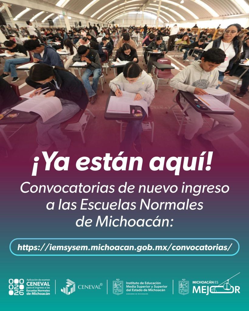 Con la publicación de las convocatorias de nuevo ingreso, disponibles en: iemsysem.michoacan.gob.mx/convocatorias/ da inicio formal el proceso de admisión correspondiente al ciclo escolar 2026-2027. Por quinto año consecutivo, la selección de aspirantes se realizará mediante el examen Ceneval, mecanismo que ha fortalecido la transparencia, el orden y la equidad en el ingreso a la formación docente.